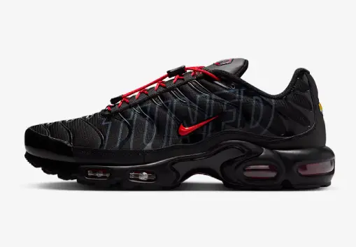 The Nike Air Max Plus Tuned Air Black Red is a standout in the Air Max lineup, known for its iconic wavy design that wraps around the shoe with dynamic TPU overlays lending both structure and style. Originally designed as a high-performance running shoe, it features Tuned Air technology—individual air pods in the sole that provide targeted cushioning and support to enhance stability and comfort during movement.
