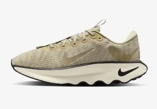 The Nike Motiva Desert Khaki is designed for ultimate walking comfort, featuring Nike’s highest level of cushioning. It incorporates a tall foam stack combined with Comfortgroove technology on the outsole, which absorbs bumps and uneven surfaces to provide a smooth ride. The shoe’s exaggerated rocker shape helps propel wearers forward, supporting a natural stride.